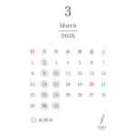 2月のカレンダー 2026年01月30日 カレンダー 2月の営業日のお知らせです。2(月) 3(火) 9(月)10(火)16(月)17(火)24(火)28(土)お休みいただきます。よろしくお願いいたします。
